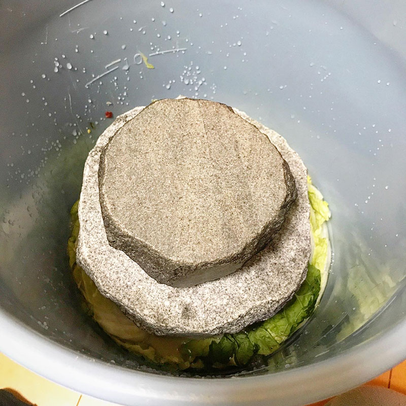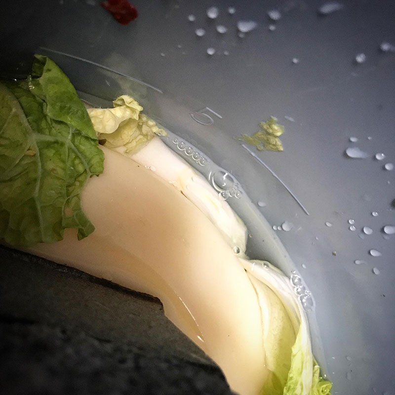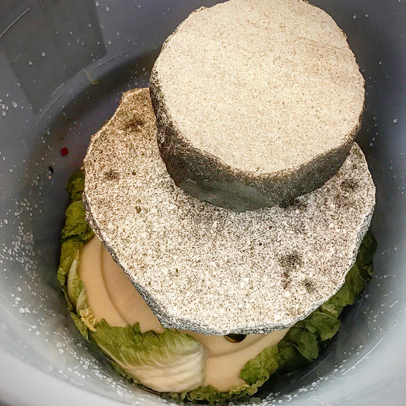 昨日の夕方、採りたてをいただいてすぐに漬けた白菜。1日で水が上がった。切ったら水がこぼれるほど新鮮だったし。白菜漬けは切った白菜を半日くらい陰干しにしてから漬けた方が美味しいっていうのが一般的に言われてるんだけど、納得できない(笑)