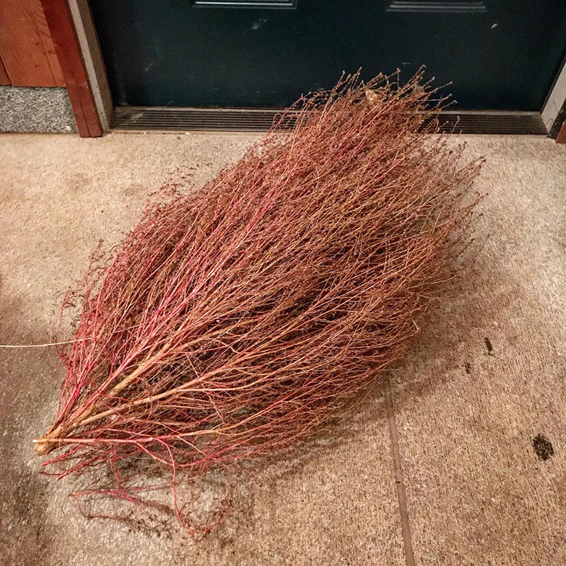 庭のコキア(ほうき草)の紅葉が終わり枝が枯れ始めたので夕方、仕事から戻って抜いた。これで玄関のほうきを作る。よく乾かして麻紐で縛るだけで土ぼこりまではける優秀なほうきができる。しかもおしゃれなのでむき出しで置いておいて気になったらすぐにはける。