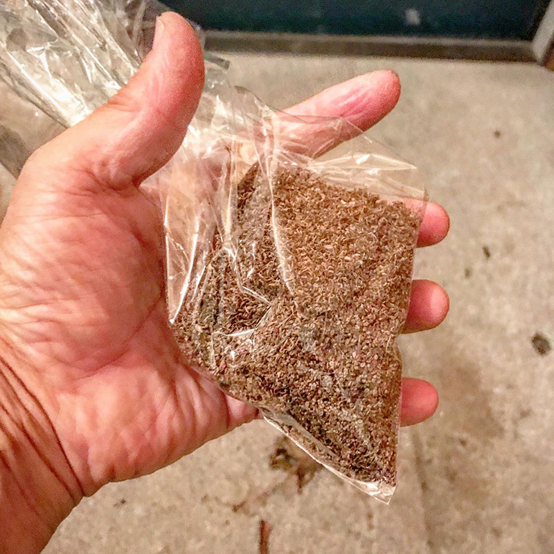 しかーし!僕がコキアを育てている一番の理由はとんぶりが食べたい!からだ。ほうきは2番。畑のキャビアと言われるとんぶり、しばらく食べてないな。スーパーで売ってるのかな。ただこれまでほうきは作れても食べられるだけの種を集められなかった。日が落ちて暗くなってしまったので玄関で袋の中に突っ込んで種をしごき取って集めてみた。