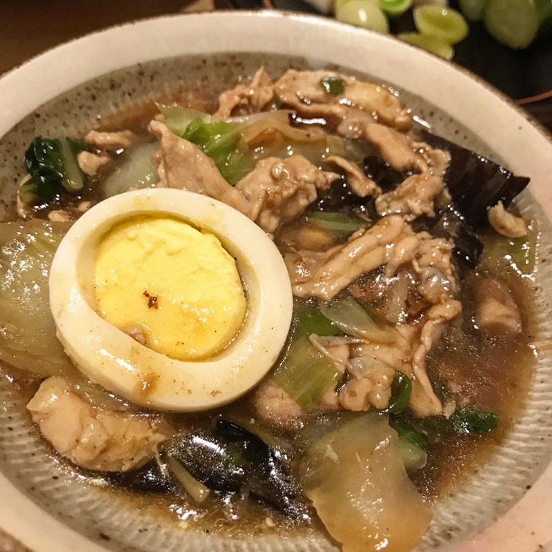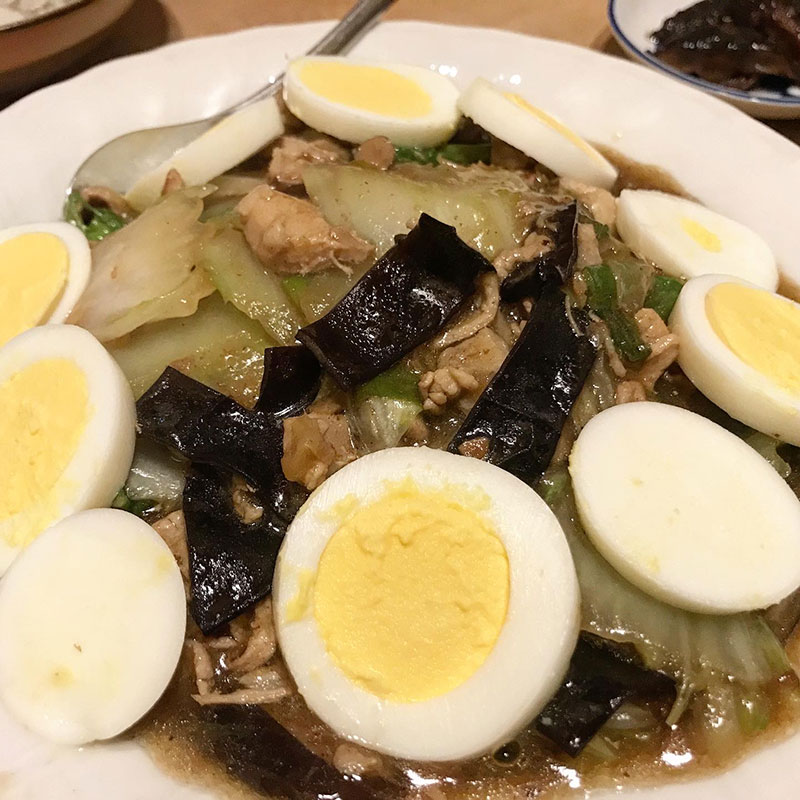 豚肉、鶏肉、キクラゲ、椎茸など家にあった食材と。