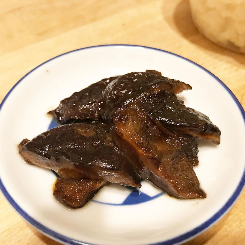 自家製の干し椎茸は焦げ目がつくまで炒めてからオイスターソースと醤油で煮込んだ。我が家の人気の一品、干し椎茸のオイスターソース煮。