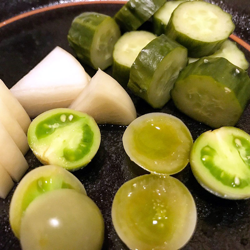 赤くなってくれない青いミニトマトのぬか漬けにハマってる。6日以上漬けると美味しくなる。