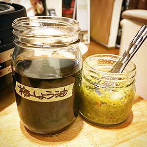 とても美味しかったゆずぽんは無くなってしまったので梅しょうゆ。残念ながら廃業してしまった地元の美味しい醤油屋さんの醤油を瓶にとって部落の名人にいただいた梅干しを入れたもの。