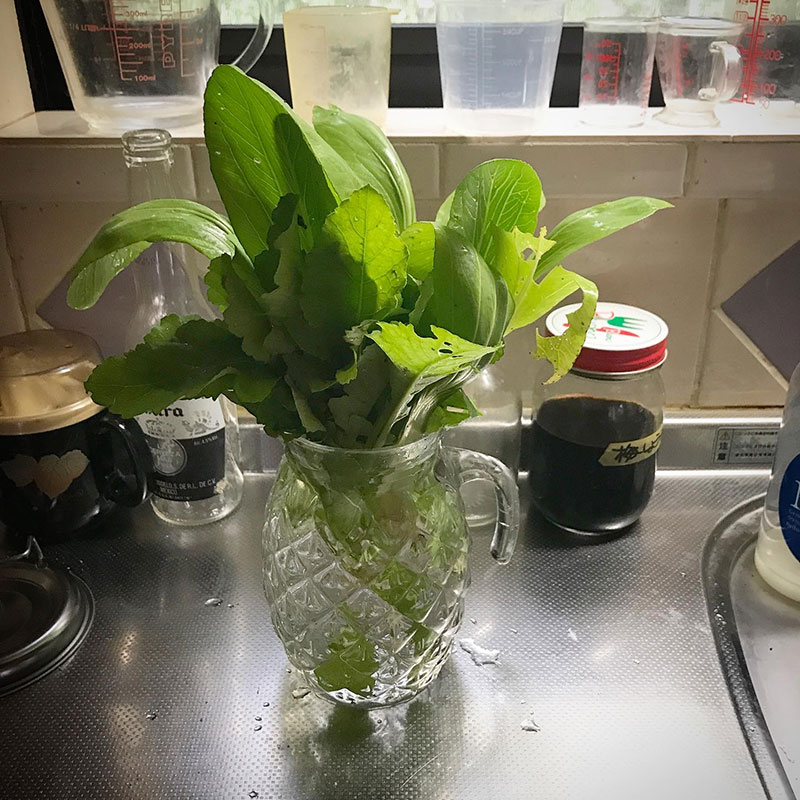 最後の青梗菜と間引いた大根。間引き大根は味噌汁に入れよう。
