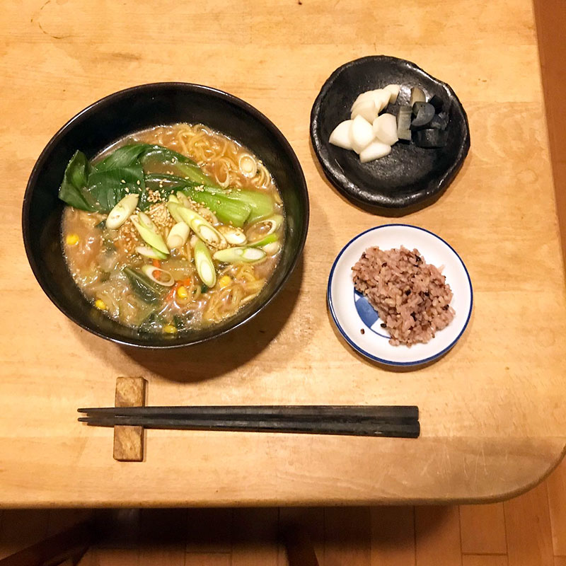 色米とぬか漬けで夕食。