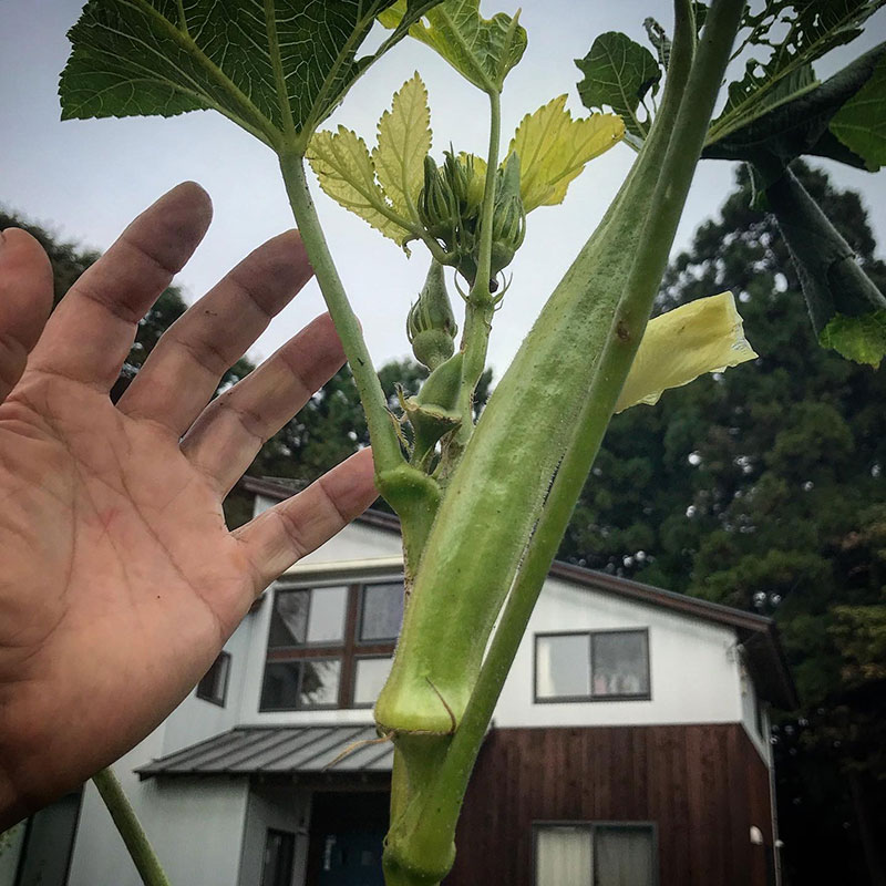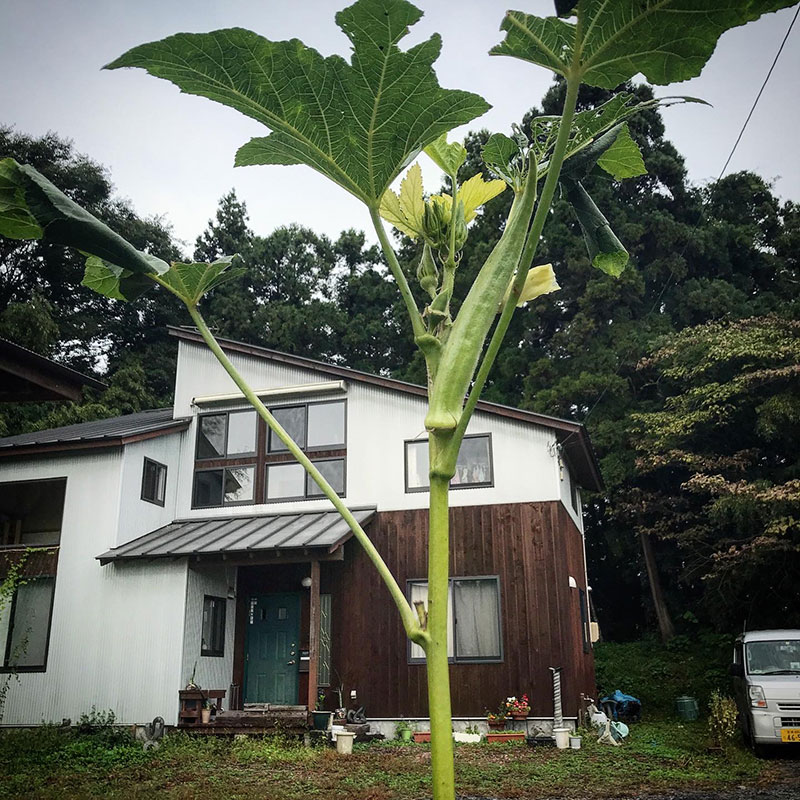 自家採種用に畑に残してある島おくら。背丈は身長を超えて大きくなった。実は畑のこのエリアに人間も飲むあるものをまいたんだけどそれが効いたのかな?来年も実験して効果がはっきりしたらお知らせも出来ますが・笑