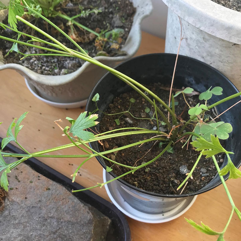 冬の間、料理に使うために畑から鉢に植え替えて家の中で育ててるパセリとイタリアンパセリ。
