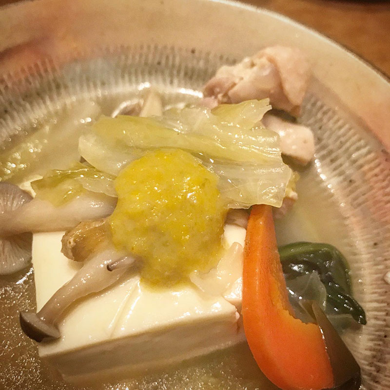 夕飯は幼なじみのまゆみさんにいたか白湯仕立ての白養なべにしたので早速、柚子胡椒もいただいた。