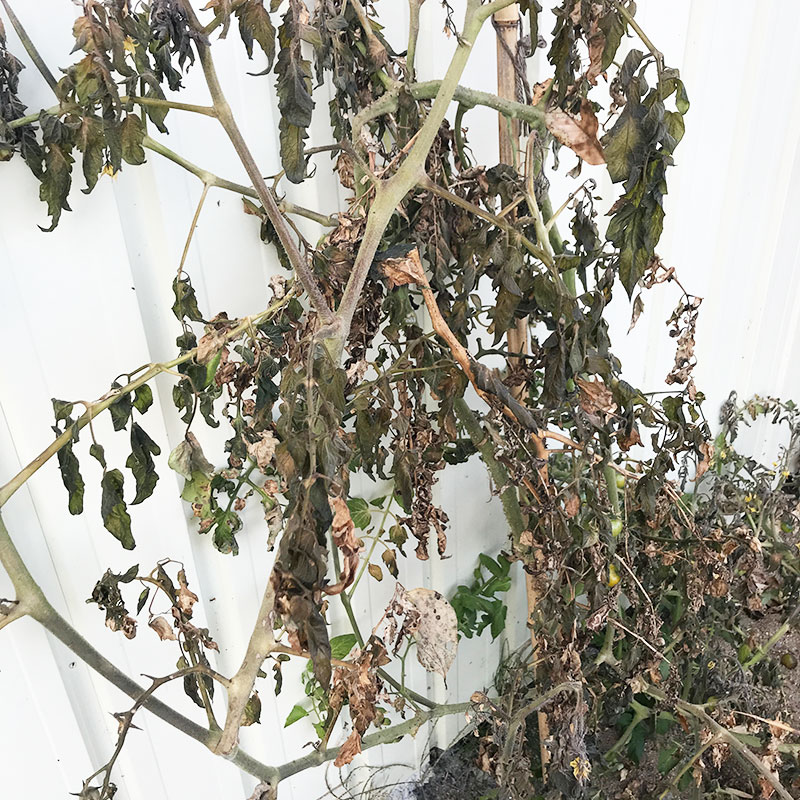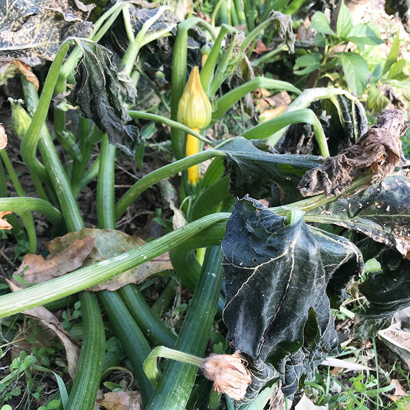 昨日の初霜で一気にしおれたズッキーニ。まだいくつか実がついているけど枯れてしまうだろうな。
