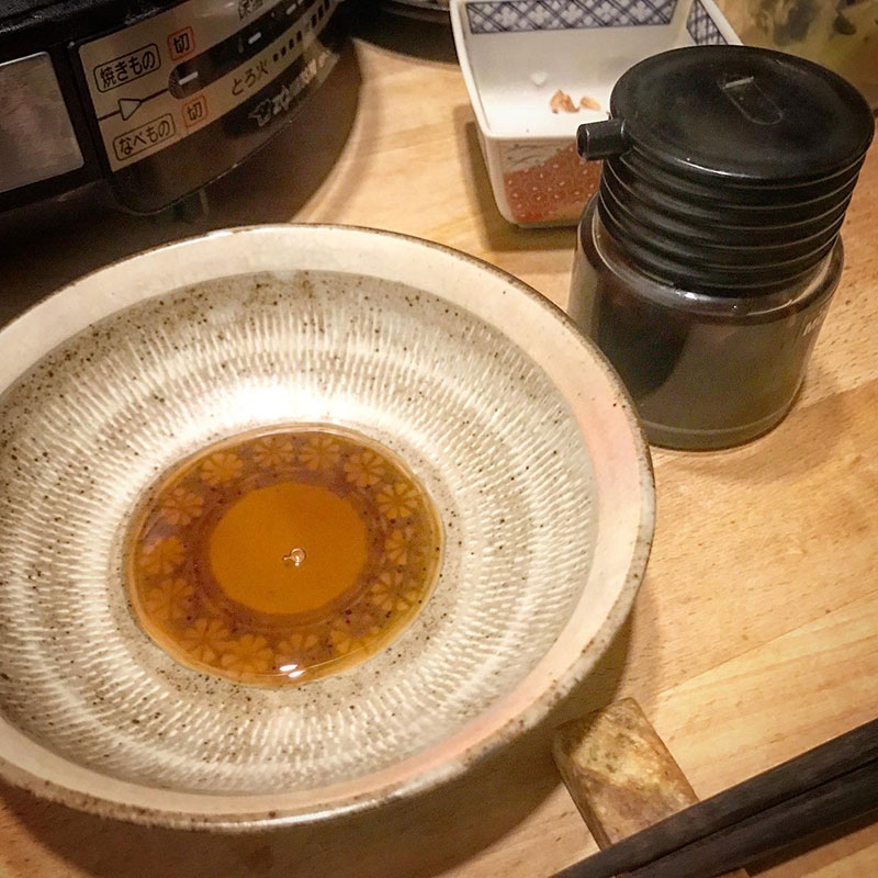 昨日、昆布や椎茸、鰹節など旨みの出るものを醤油にただ放り込んで漬けてる出汁醤油に柚子の果汁たっぷり絞ったもの。