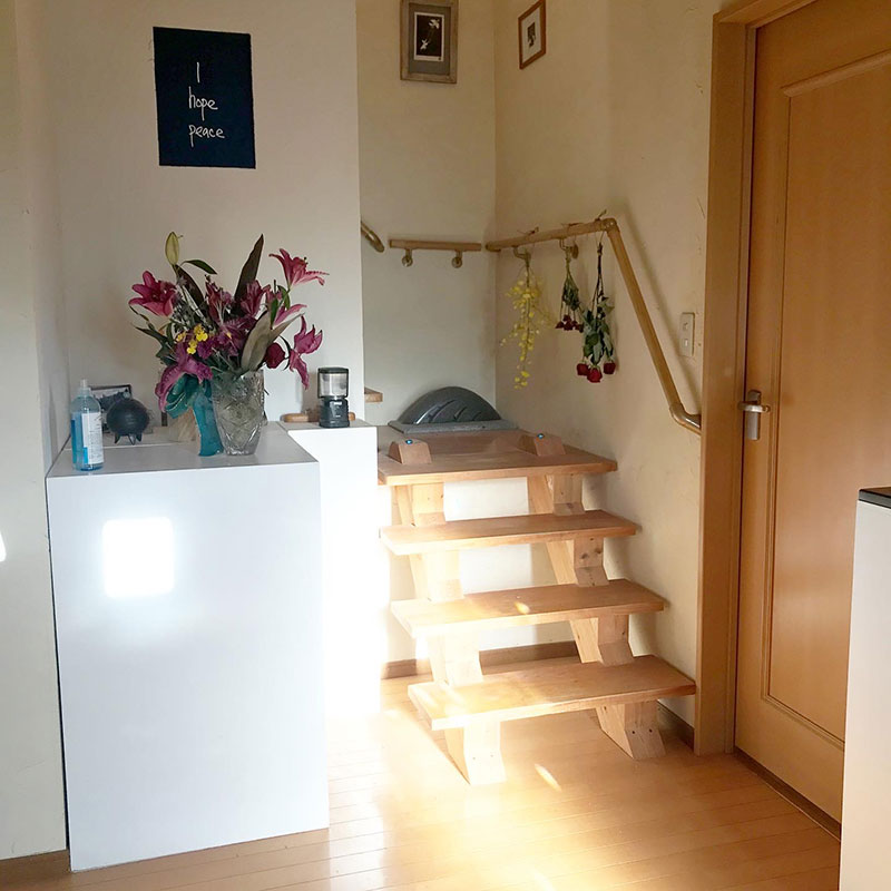 個展の際にいただいた花で玄関が華やかで香る。蕾だった紅い百合が咲いた。盛りを過ぎた薔薇や蘭は初めてのドライフラワーに。