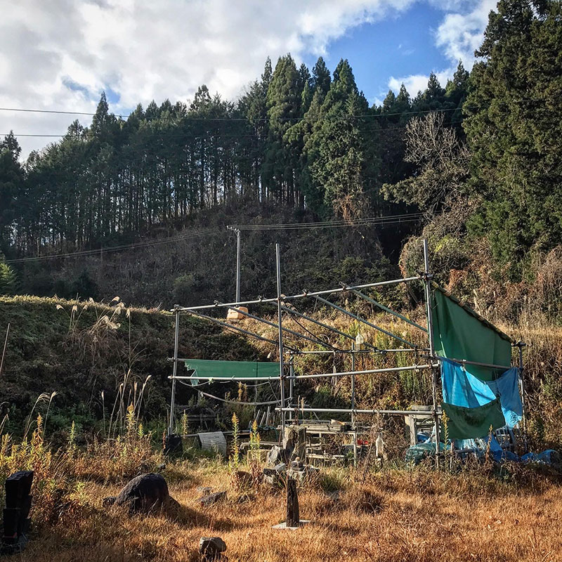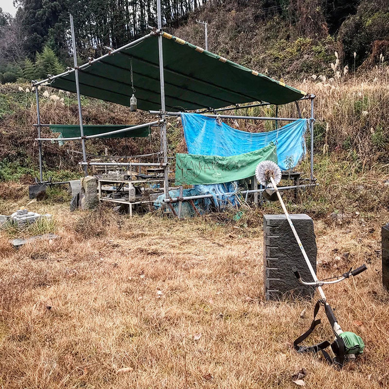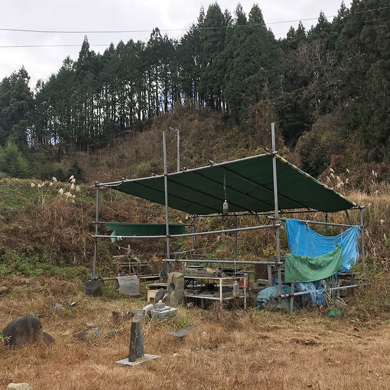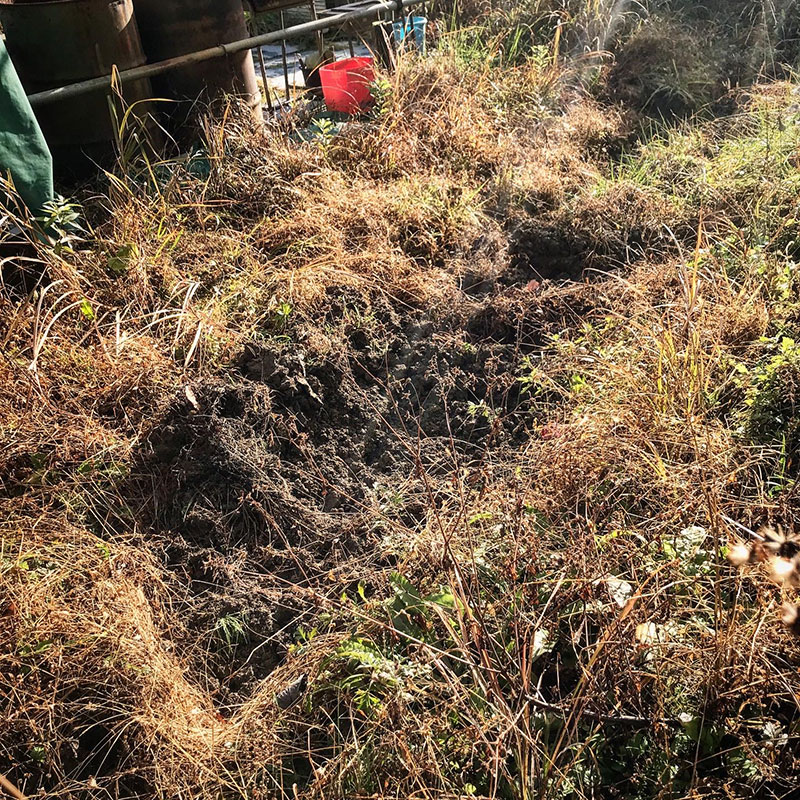 テント周りかなり深く掘り返されている、イノシシに。冬が来る前にたっぷり栄養とっておかないと死んでしまうから彼らも必死。この時期必ずあちこち掘り返される。広い仕事場の全面を掘り返された年もあった。畑か!と突っ込みたくなるくらいふかふかにされた。