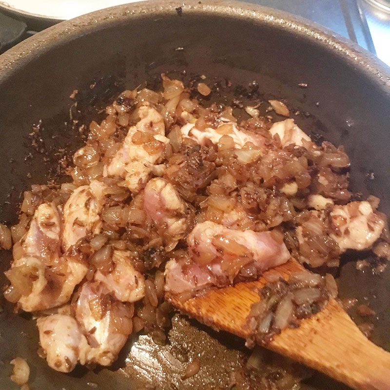 更に少しスパイス加えて鶏肉を炒めるて水を注いで。ルーは夕方入れる。
