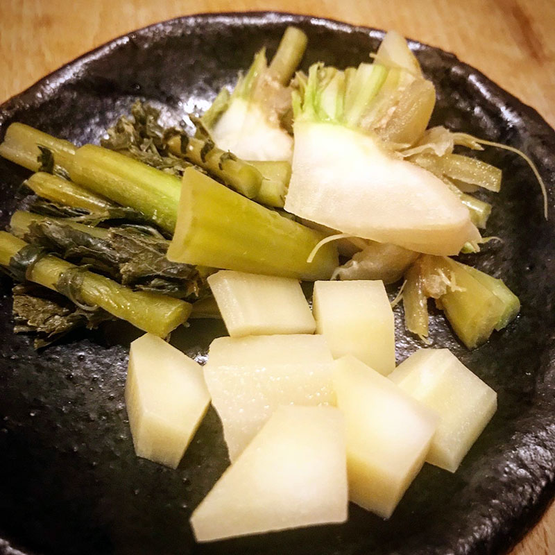 ぬか漬けはブロッコリーの芯。これは定番になりそう。奇をてらわず美味しい。そして大根葉のぬか漬け。