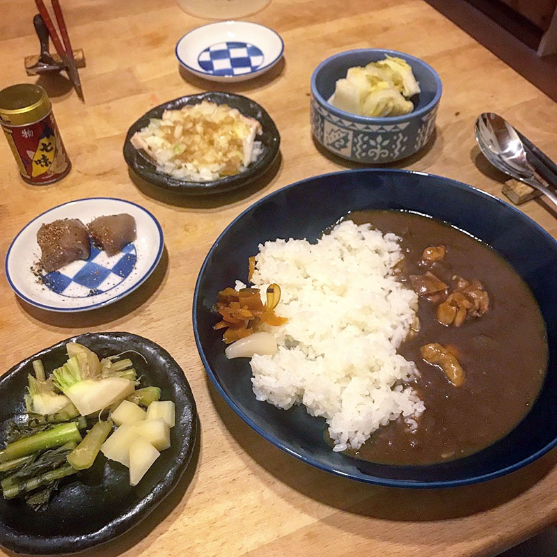 昼に仕込んでおいたスパイスカレーを炊き立てのササニシキにかけて夕食。
