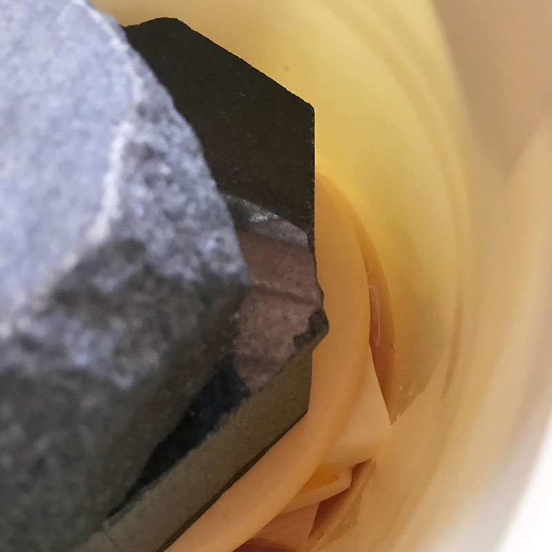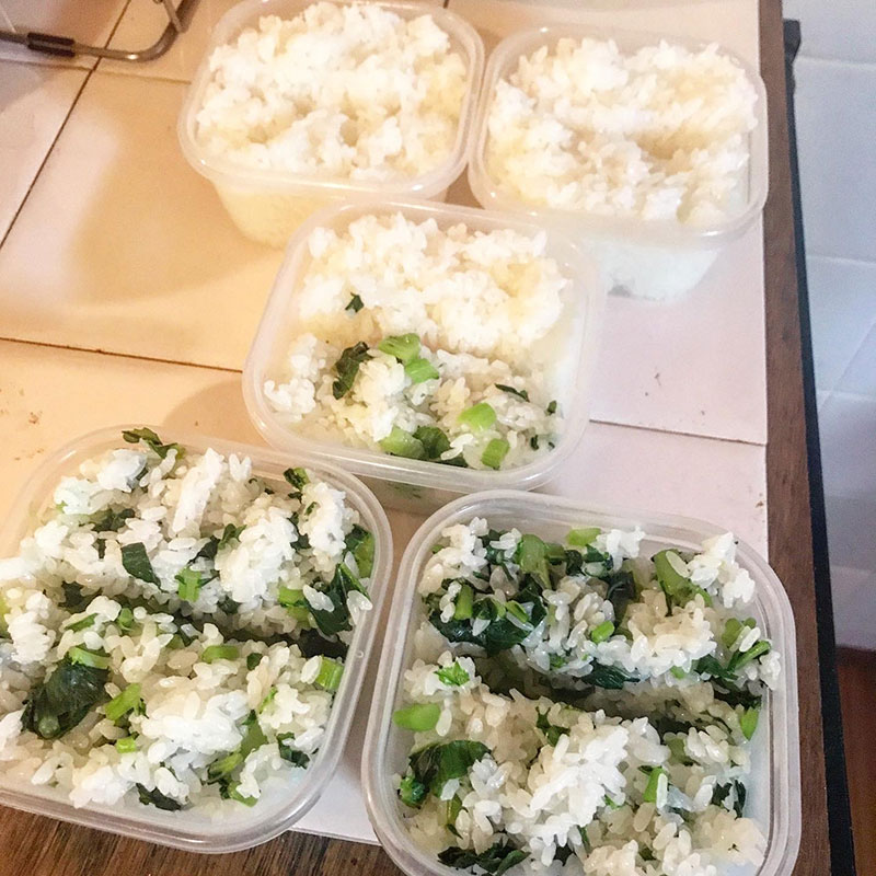 タッパーに詰めたご飯に切り込みを入れてるのは一回に半膳しか食べないので冷凍しても半分だけ取れるように。