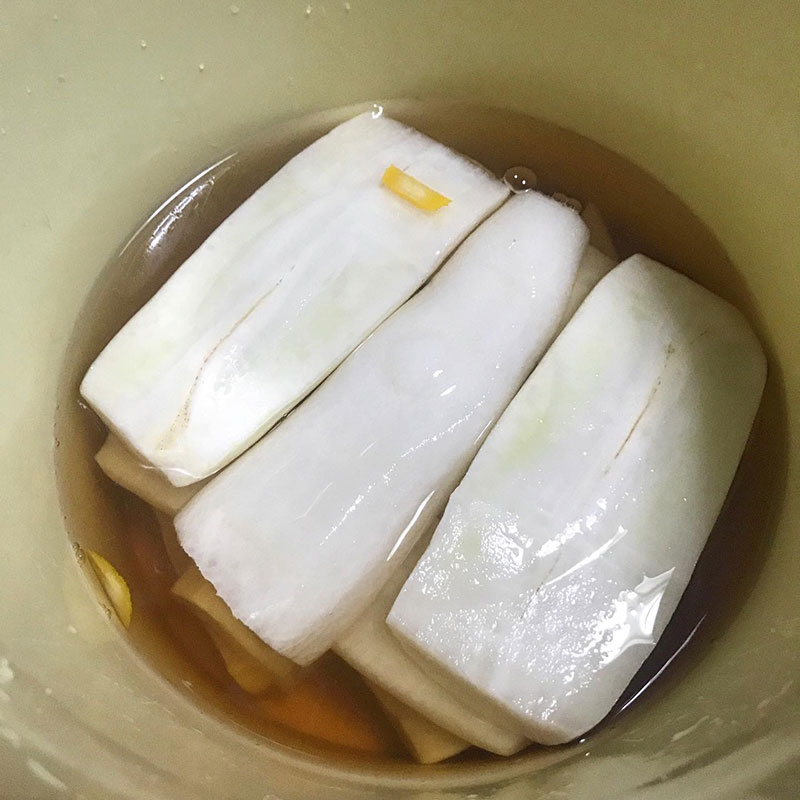 昨日仕込んだ大根の生漬け。朝見た時よりさらに水が上がってる。順調。