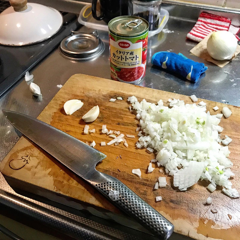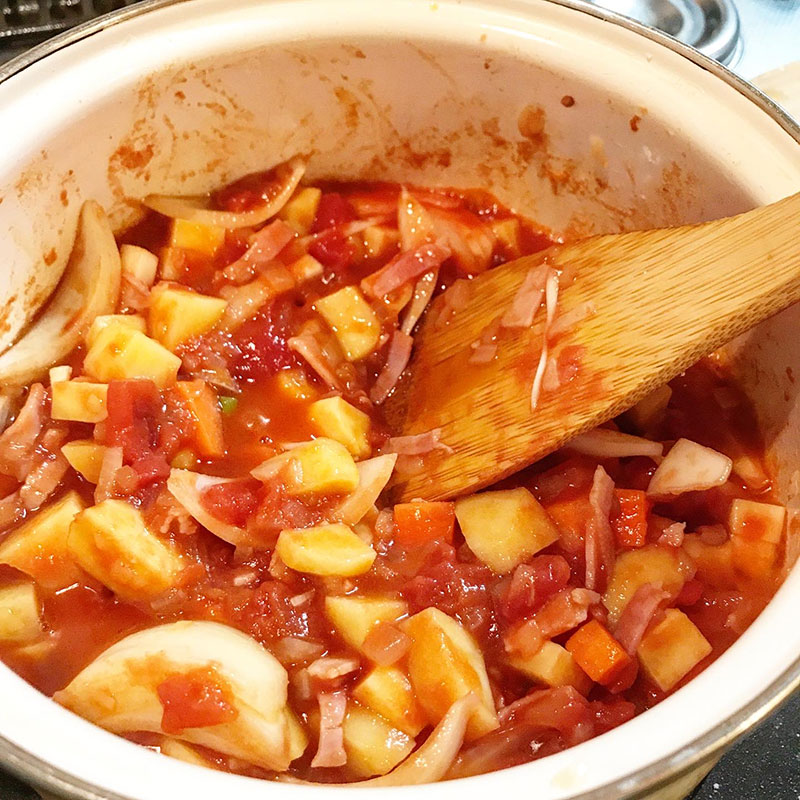 トマト缶入れた後、焦げないように気をつけながら少し煮詰めてから