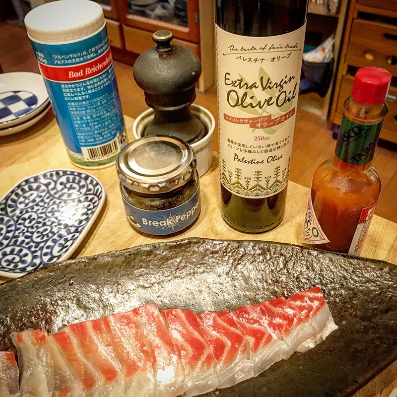 塩と生胡椒とパレスチナオリーブ回しかけて。