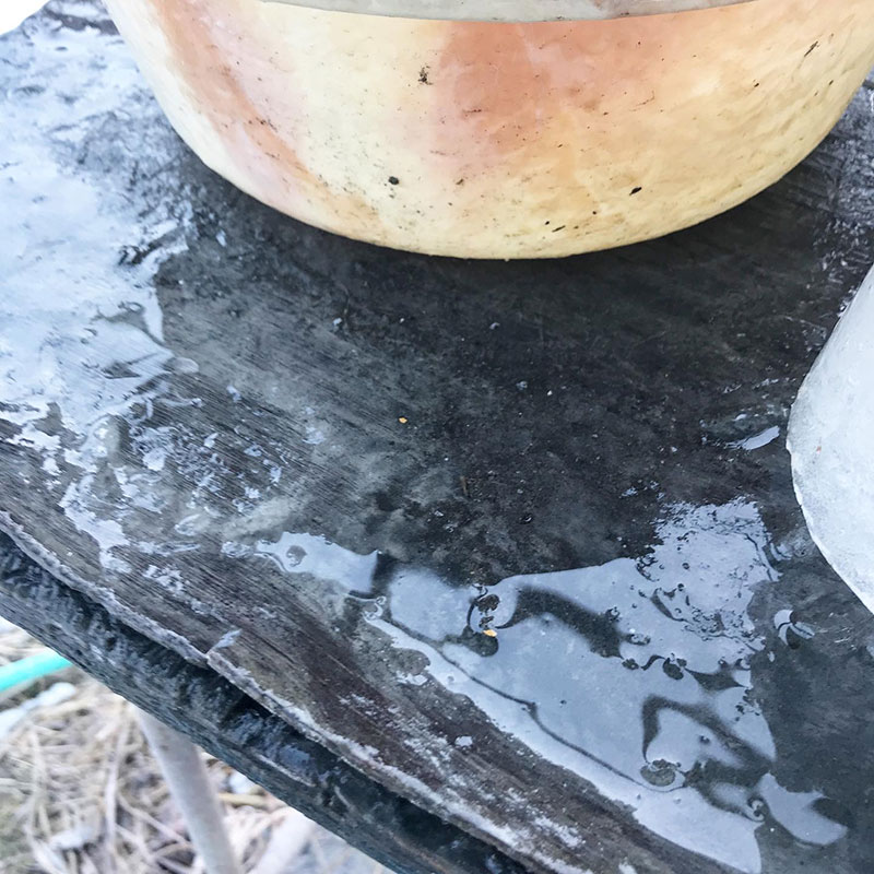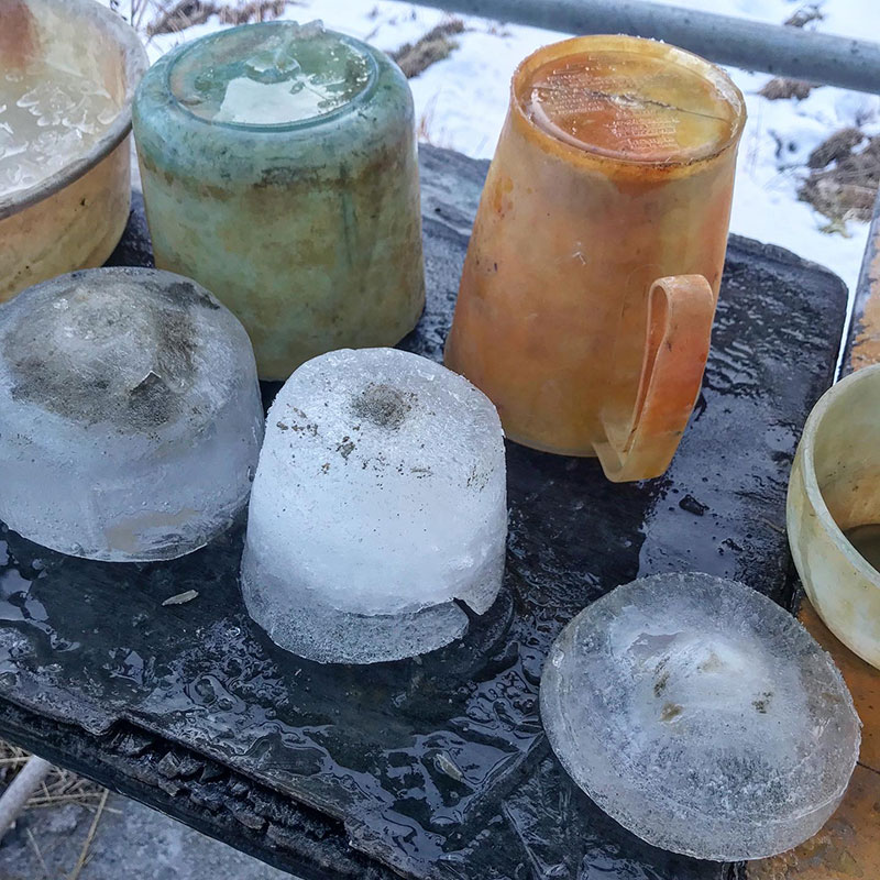 石のテーブルの上に1週間前に作った氷の彫刻もそのまま立ってる。まだ数日、氷点下10℃近くまで下がりそうだし日中も最高気温が氷点下の日があるみたい。これほどまでに凍るのは珍しい。