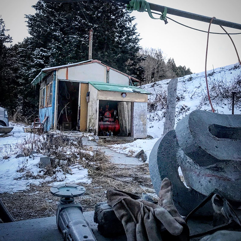 。。。ていうか僕は頭も身体もおかしくなってるのかものつくりの悪魔に取り憑かれたのか今、制作の山場で緊張&興奮&面白いからか寒さ感じないんだけど、道具はそうはいかない。氷点下だとノミはポキポキ折れるし、電気グラインダーもエアーツールも氷のように冷えるから手が冷たくて辛い、というより道具の寿命をどんどん縮めているんだろうな。仕事終わりに圧縮空気を吹き出して全身石のホコリにまみれたのを吹き飛ばして帰るんだけどツールを高速で通る空気が熱を奪い圧縮空気を吹き出して欲しいツールのノズルが凍って風も出てこない。そうか、こんなに寒かったのか。エアーツールのノミはよく折れずに今日の仕事に付き合ってくれた!
