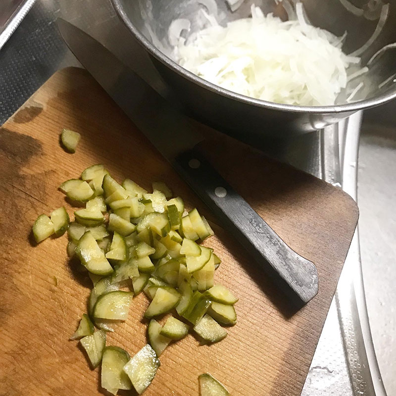 きゅうりが無かったので漬けて4日目のピクルスの様なきゅうりのぬか漬けを細かく切って合わせたら正解。