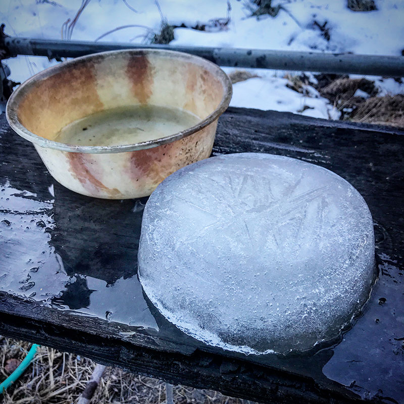 仕事場へ。この凍り方はハンパ無い。洗面器の雨水が丸ごと凍ってる。しかも一晩で。こんな事初めて。水面の何cmか凍るのはいつものことだけど底までとは。そして冬は午後山の影で日が当たらない僕の仕事場は日中も氷は溶けない。冷えてるねー。