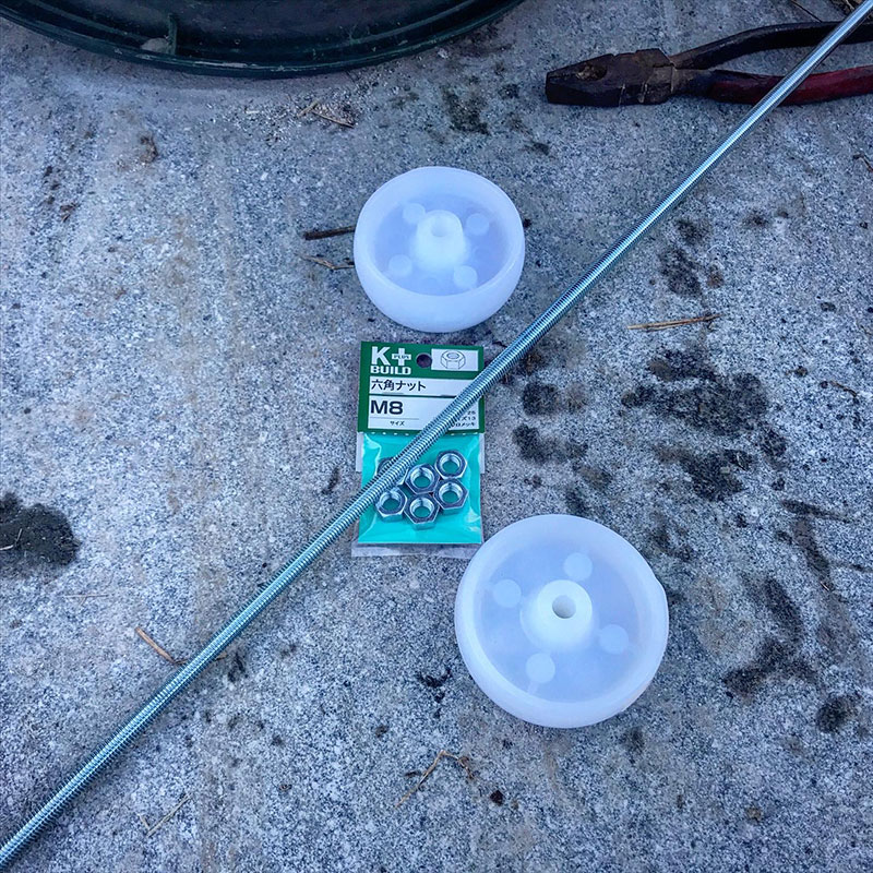なので長ネジとボルトとプラスチックのタイヤ買ってきて付け替えた。