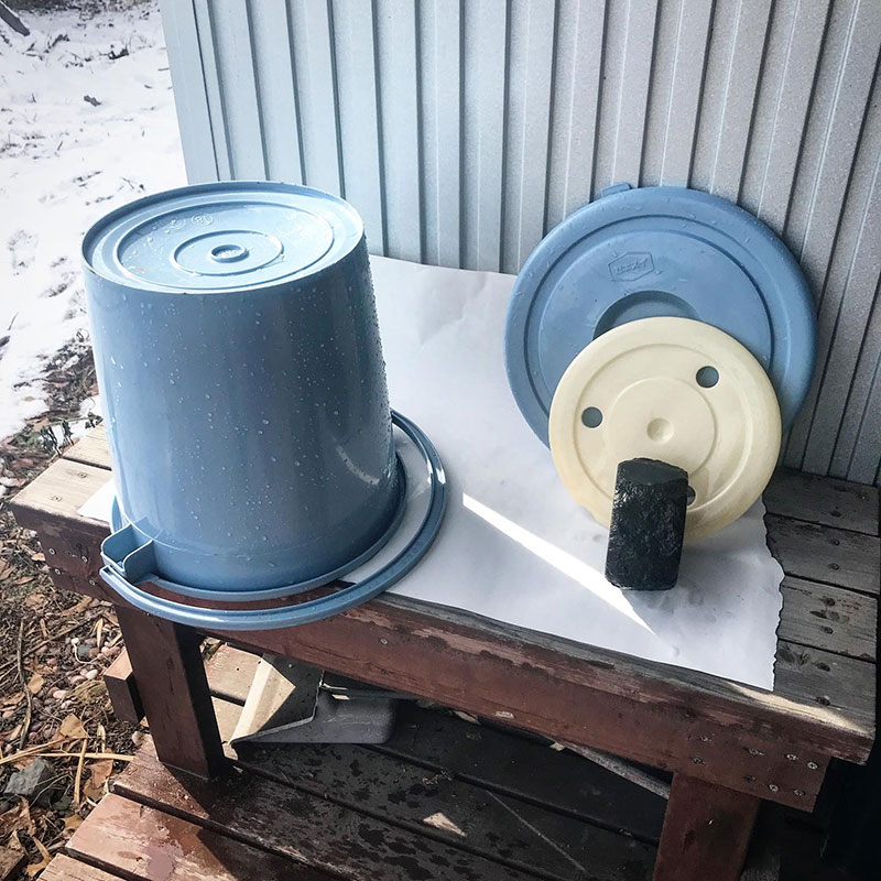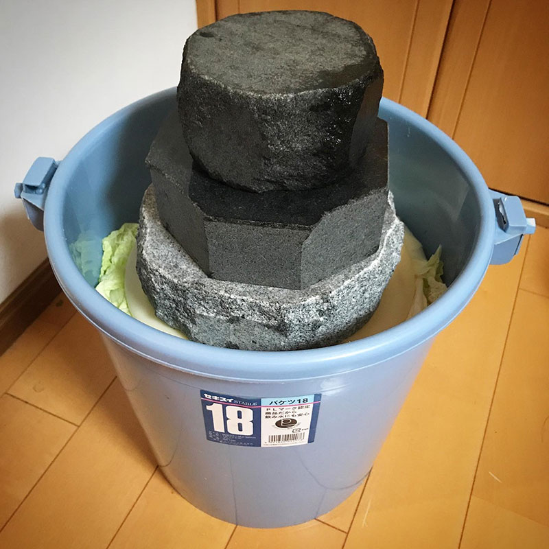 自作の4,5kg、3,5kg、2kgの重石全部乗せる。この3つの重石の組み合わせでちょうど良い重さに調整できて便利。水が上がって白菜を越えるまでは重くぎっちりと。水が上がったら軽くしていく。