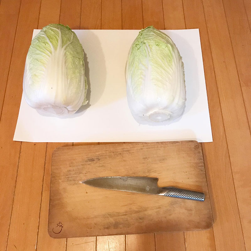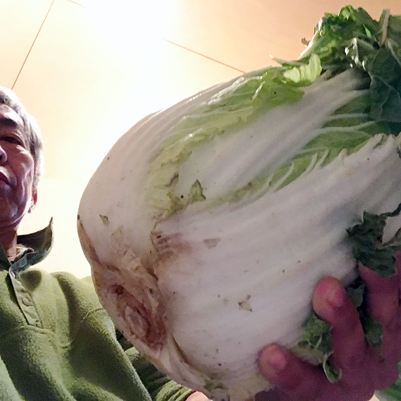 年末にいただいて一番寒い部屋に新聞にくるんで保存してるひとつ3kgもあるずっしりと重い大きな白菜。