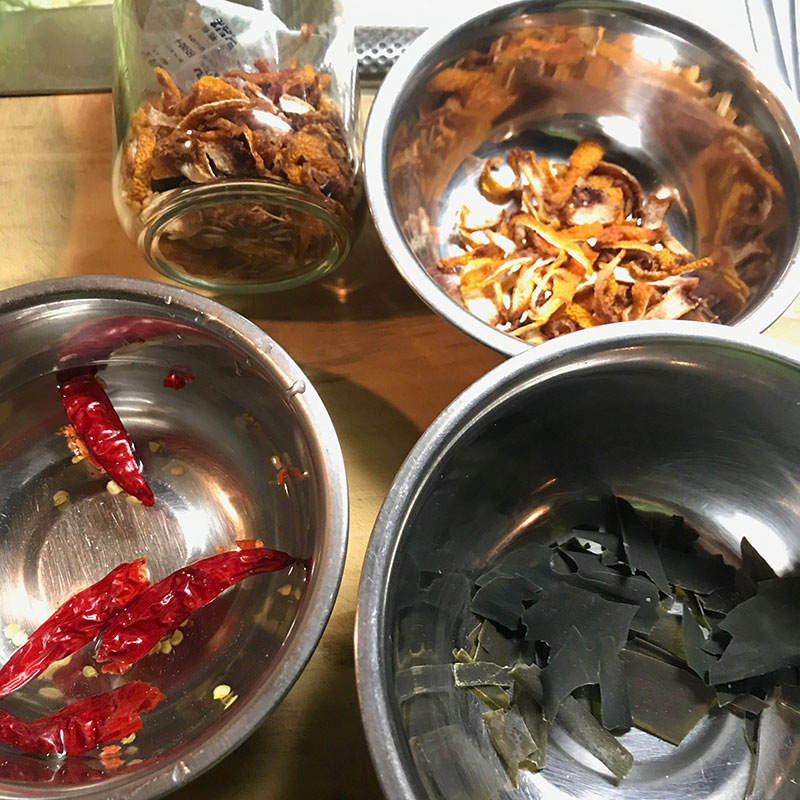 風味付けはいつもの様に昆布、干して保存しておいた柚子の皮、鷹の爪。畑で作って乾燥させておいた鷹の爪の種が滅茶苦茶辛いので取り除く。