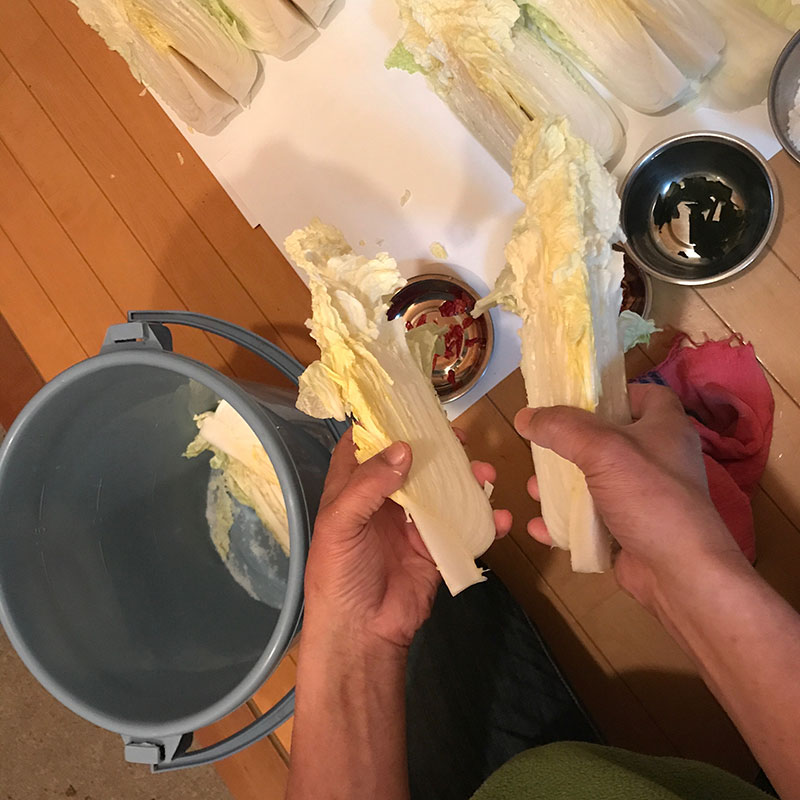 樽に詰めるときは芯を互い違いに。そして葉が芯の下になる様に。そうしないと芯に塩を振れない。