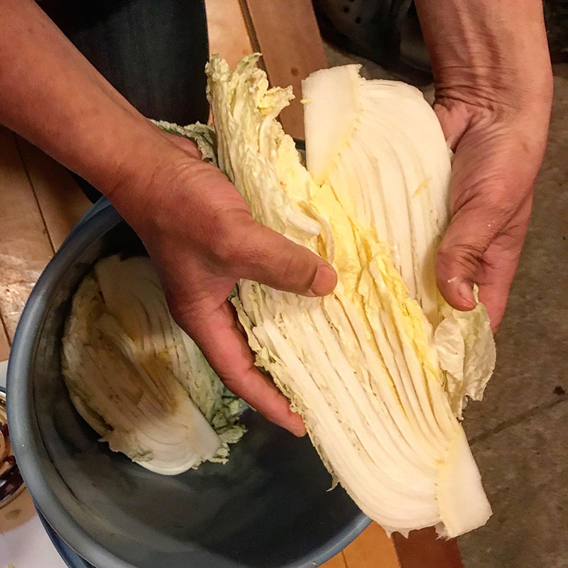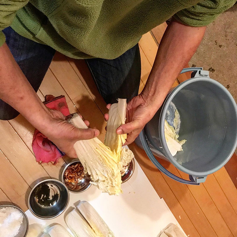 葉は塩水で簡単に漬かるから芯にはしっかり塩が行き渡るように。この詰め方で水の上がり方と甘くて美味しい芯に漬かるかが全然変わってくるので一番大事なとこら。