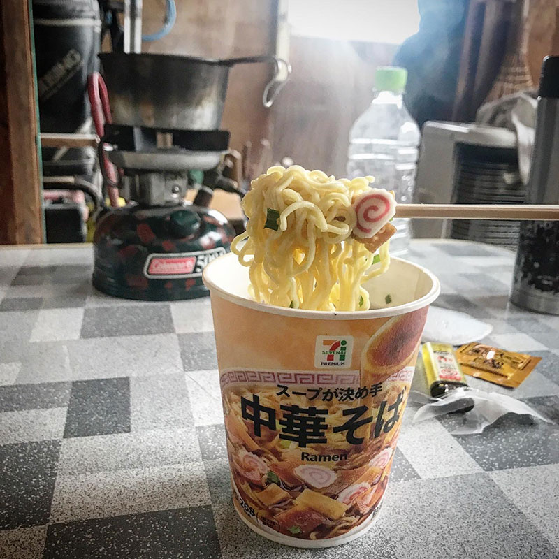 仕事場のプレハブ小屋でカップラーメンとコンビニおにぎりの昼飯にする。カミさん仕事で昼も家に戻らないので。家と仕事場の往復20分とたくさんの道具の片付けと再セッティングとか全部で小一時間節約できる。