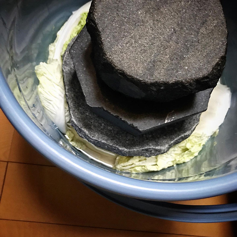 48時間前(一昨日、仕込んだ直後) ちなみに重石3つで10kg。少なくとも明日まではこのまま。後は様子を見ながら軽くしていく。