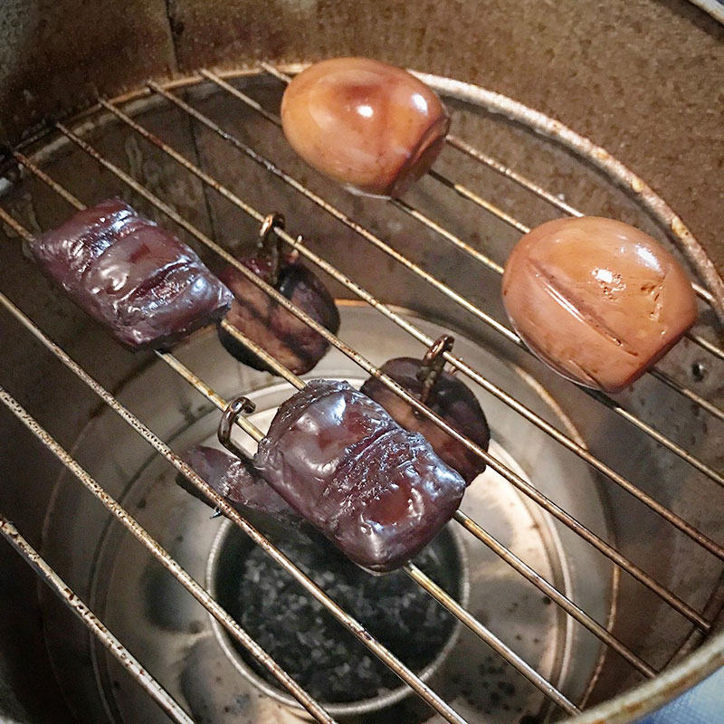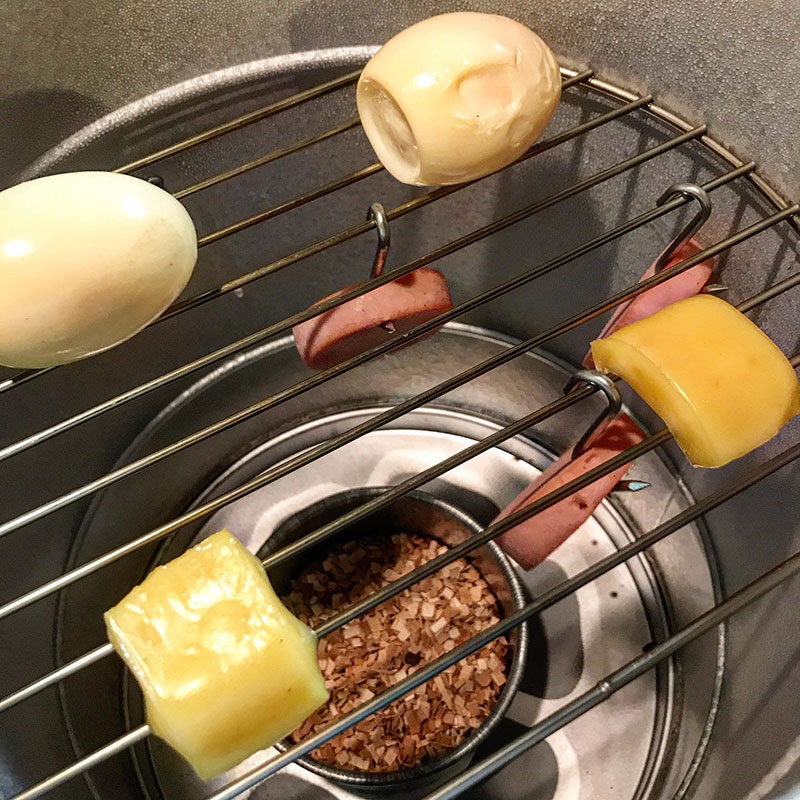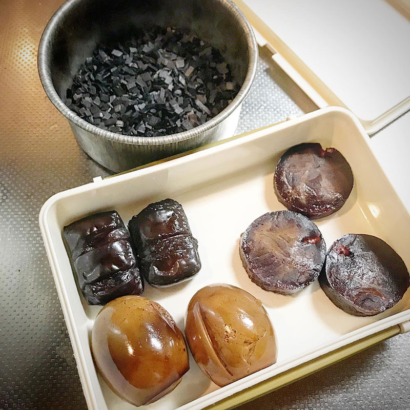 今度バーベキューコンロでやるなら炭の量を何倍にもして細かく動かして調整できるようにしてやってみよう。上手く使えば美味しい燻製、手軽に出来そう。それに今、家の中はほとんど燻製の匂いはしてない。少ない量をさらっとやるなら台所でも全然大丈夫かも。