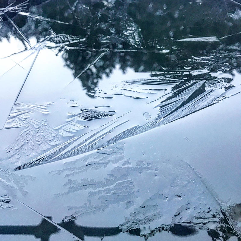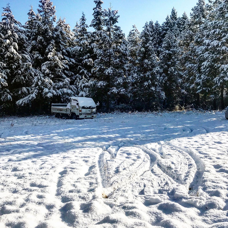 車の轍で描くダブルハート、今朝のはかなり下手。