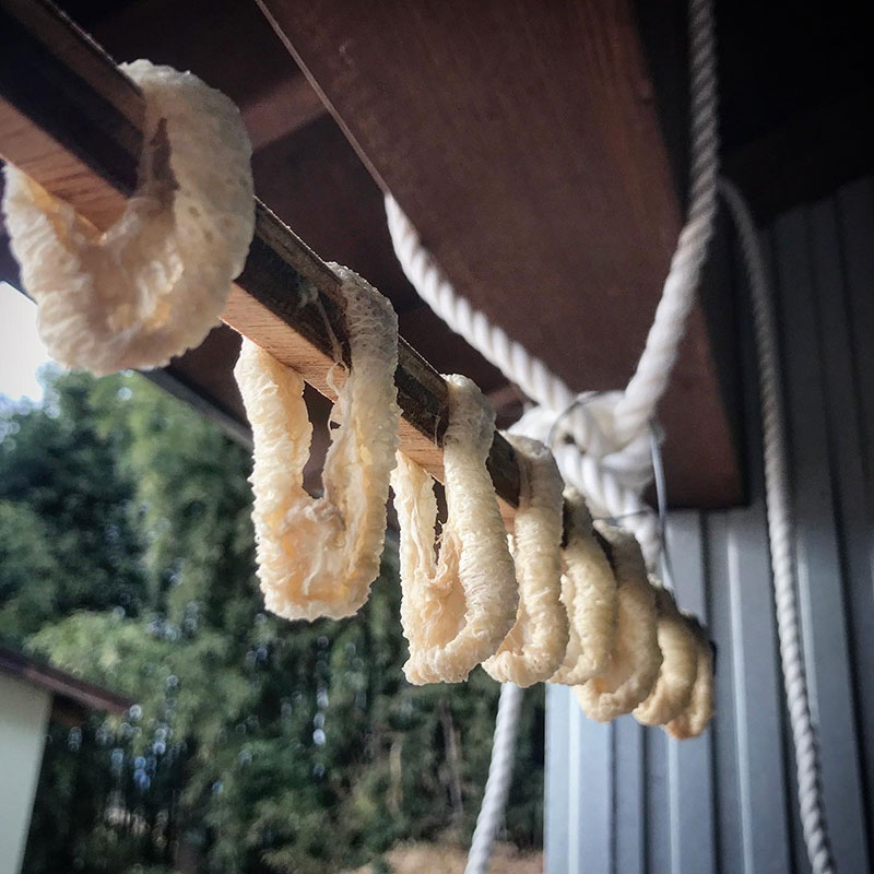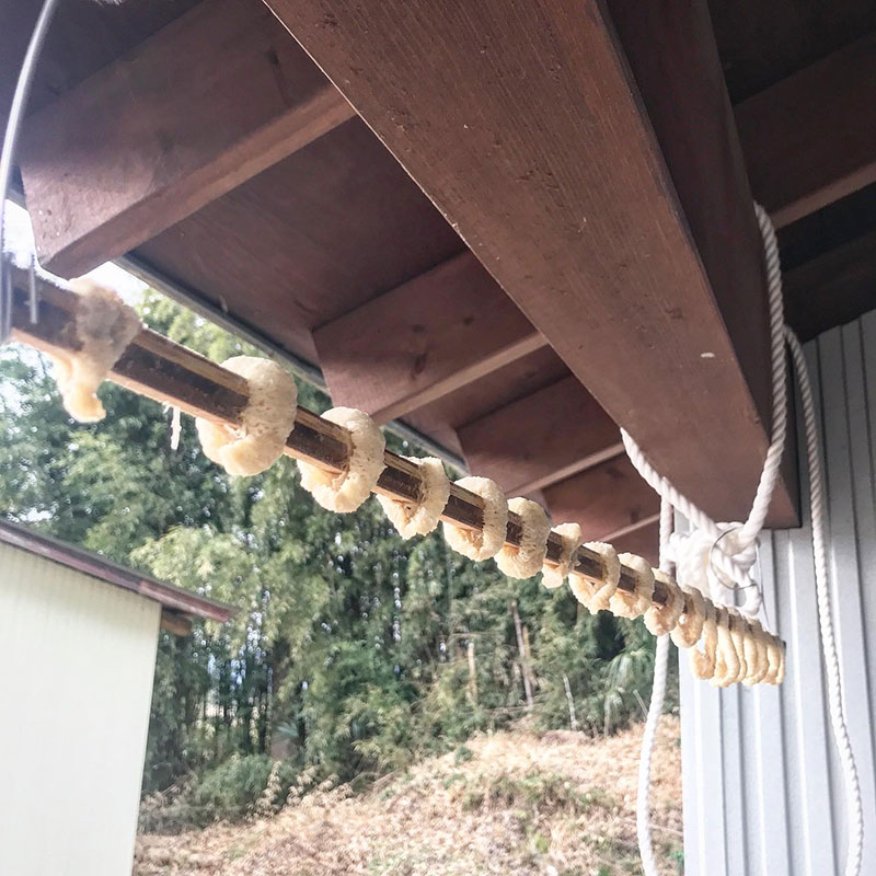 9日前に仕込んだへそ大根(干し大根)。柔らかく茹ですぎて棒に刺す時にいくつか割れた。