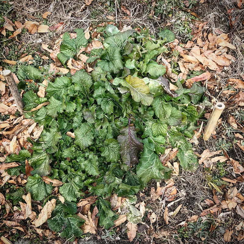 自家製の粒マスタードを作るために家の土手に植えてあるからし菜。雪と氷の中で良く薄い葉が凍って溶けて無くならないもんだ。