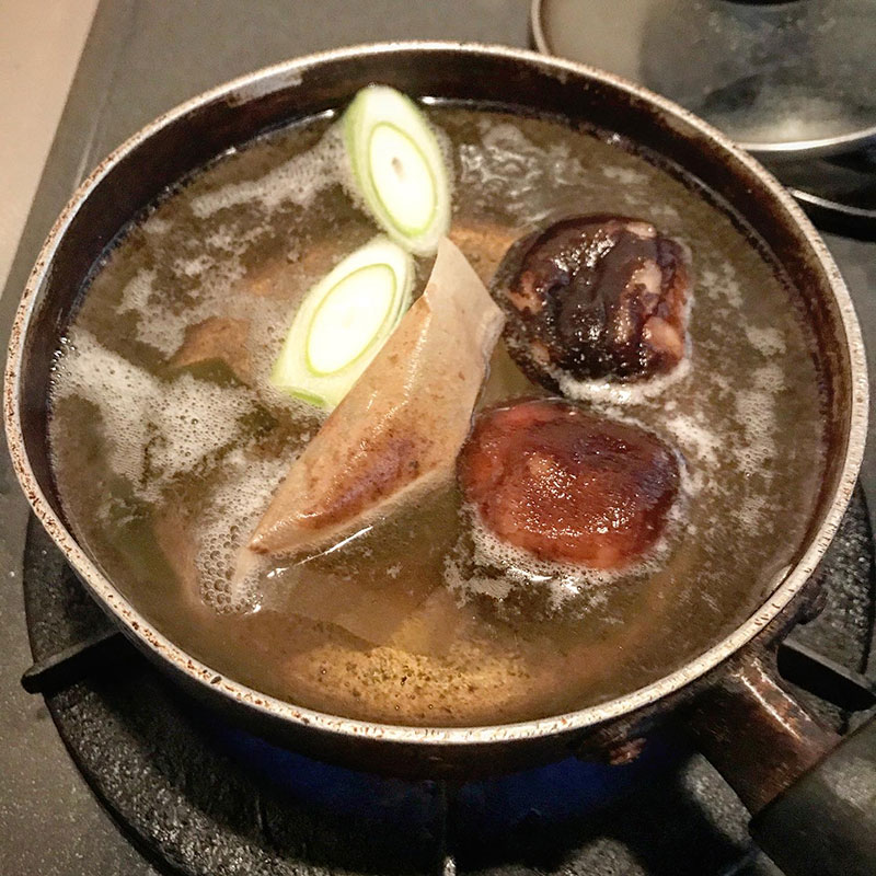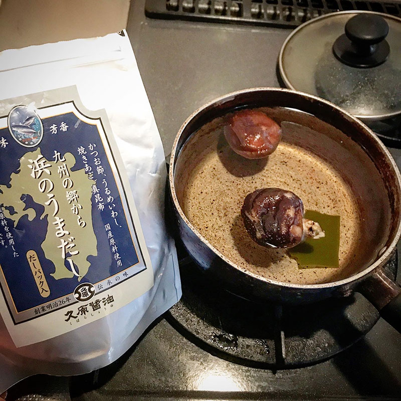 一晩、2人分の1Lの水に干し椎茸と昆布を浸けておいた鍋に「浜のうまだし」という美味しい出汁パックも入れてベースの出汁に。そこに中華だし小さじ3、普通のごま油小さじ1、金ごま油小さじ1、自家製柚子胡椒小さじ1、塩小さじ1(出汁パックはそれだけで美味しいお吸い物になるくらいの塩も入ってるので控えめに)。