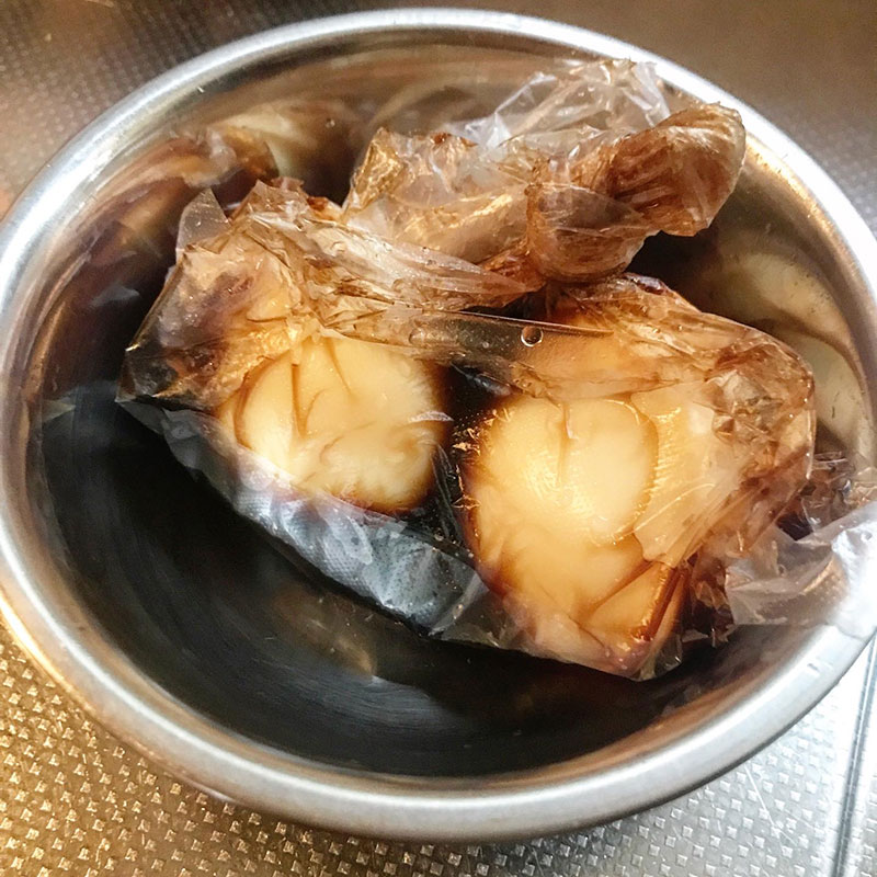 朝半熟に茹でた卵を出汁醤油と一緒にビニール袋に入れてボールの水の中で簡易真空にして縛っておいた。これだと少ない醤油で充分全体に味がつく。