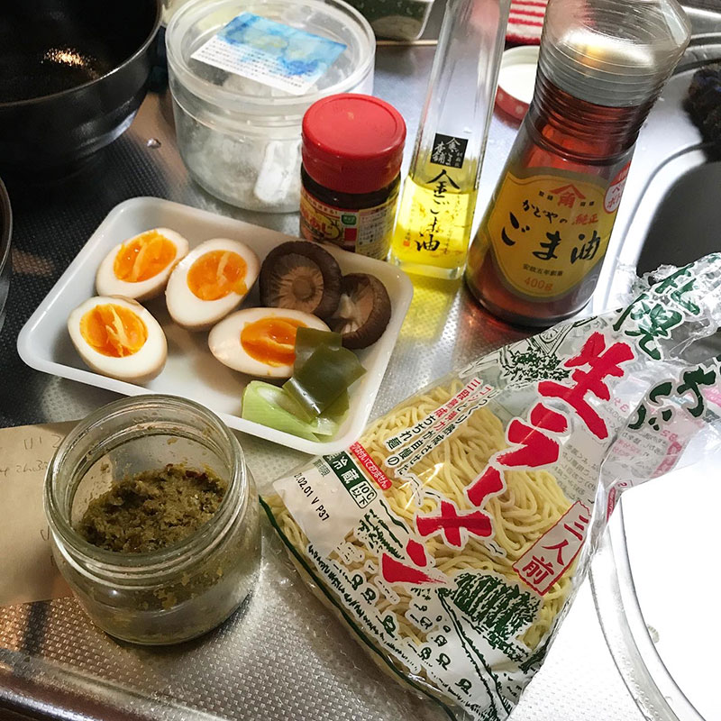 生麺茹でて、具に味付け半熟卵と出汁を取った干し椎茸と昆布、長ネギ乗せて出来上がり。
