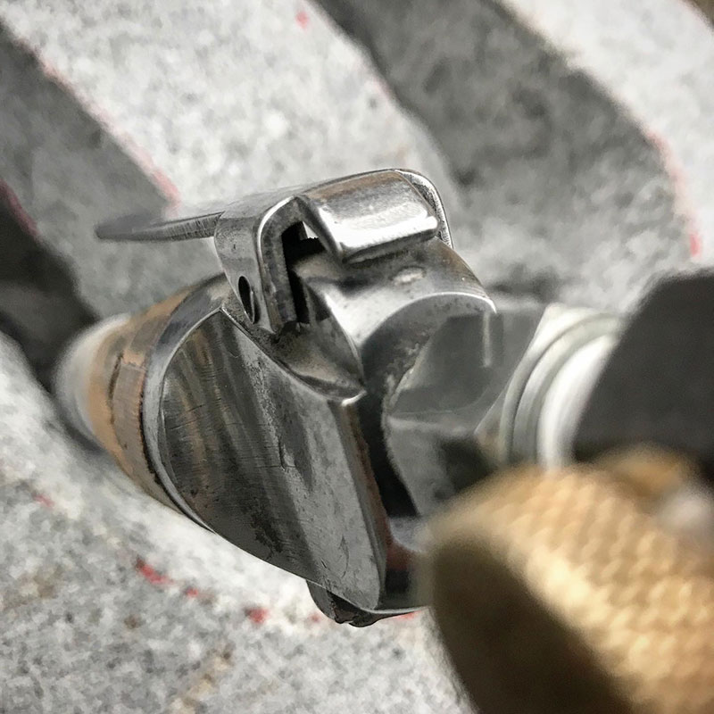 細い穴を通してその先にある石を彫り取らなければ形にならない。本来の角度で使えないから機械に負担がかかるしノミ自体も折れやすくなるけど、これ以外にもうどの道具も届かない。