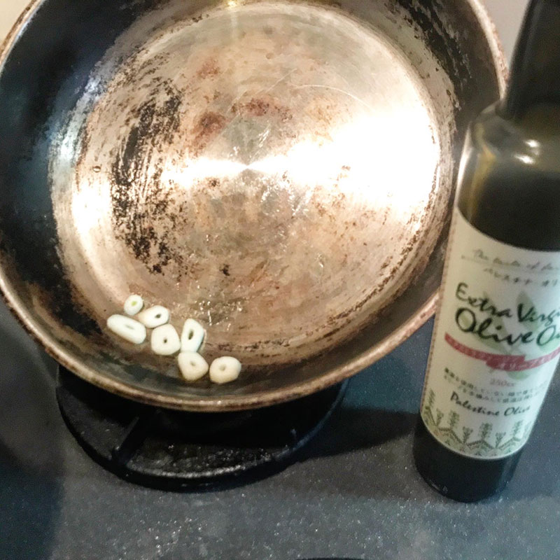 パレスチナオリーブのオリーブオイルでじっくりニンニクに火を入れた。