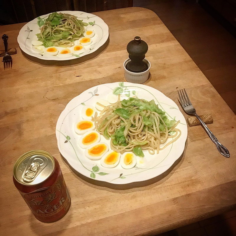 パスタと一緒に茹でた卵も盛り付けてビールのつまみに。