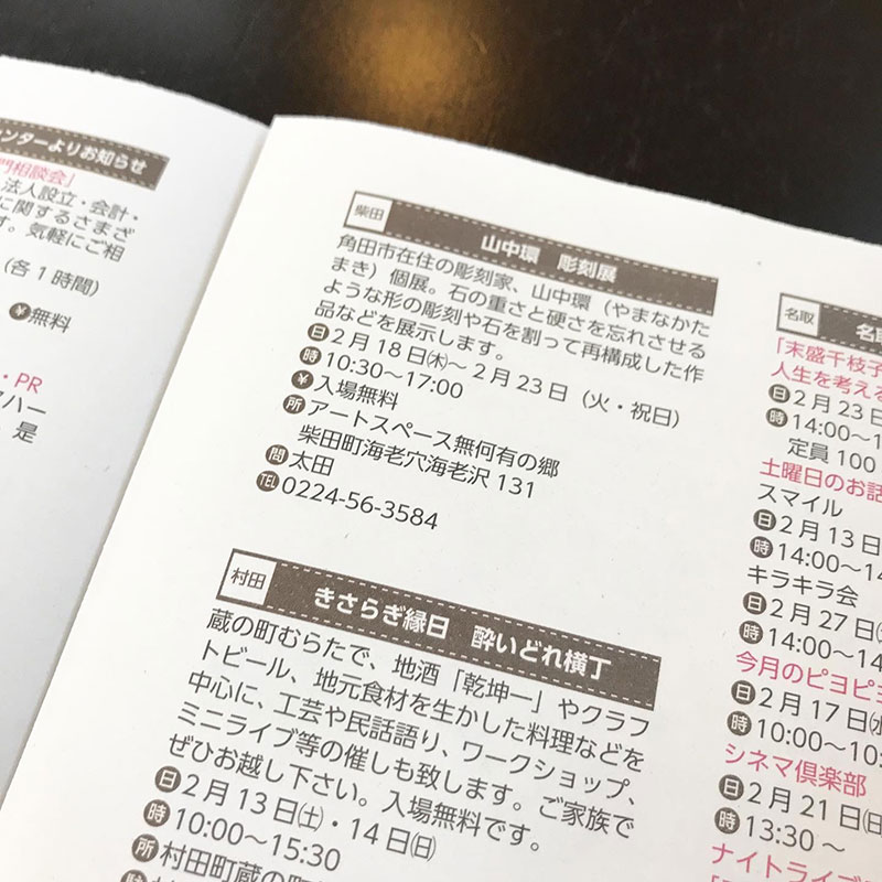 毎月発行されてる宮城県南部の情報紙。イベント情報もたくさん掲載されている。