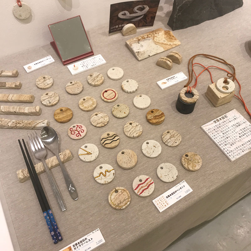天草木目石のペンダント、カトラリーレスト、カード立て、伊達冠石の一輪挿し、透明樹脂と石を組み合わせた作品などちょっと盛り沢山すぎたかな?