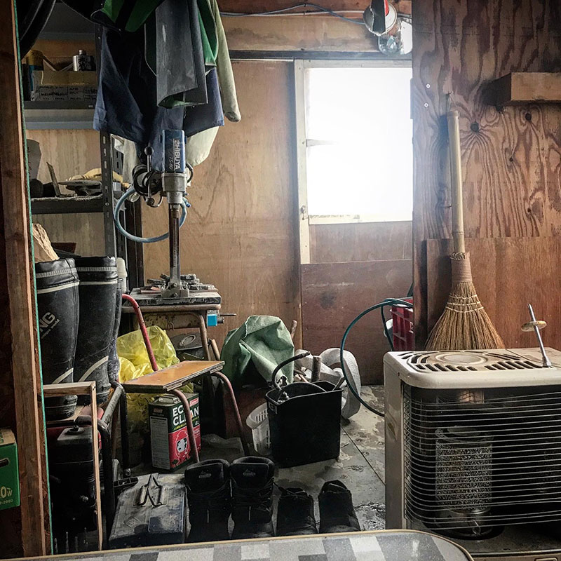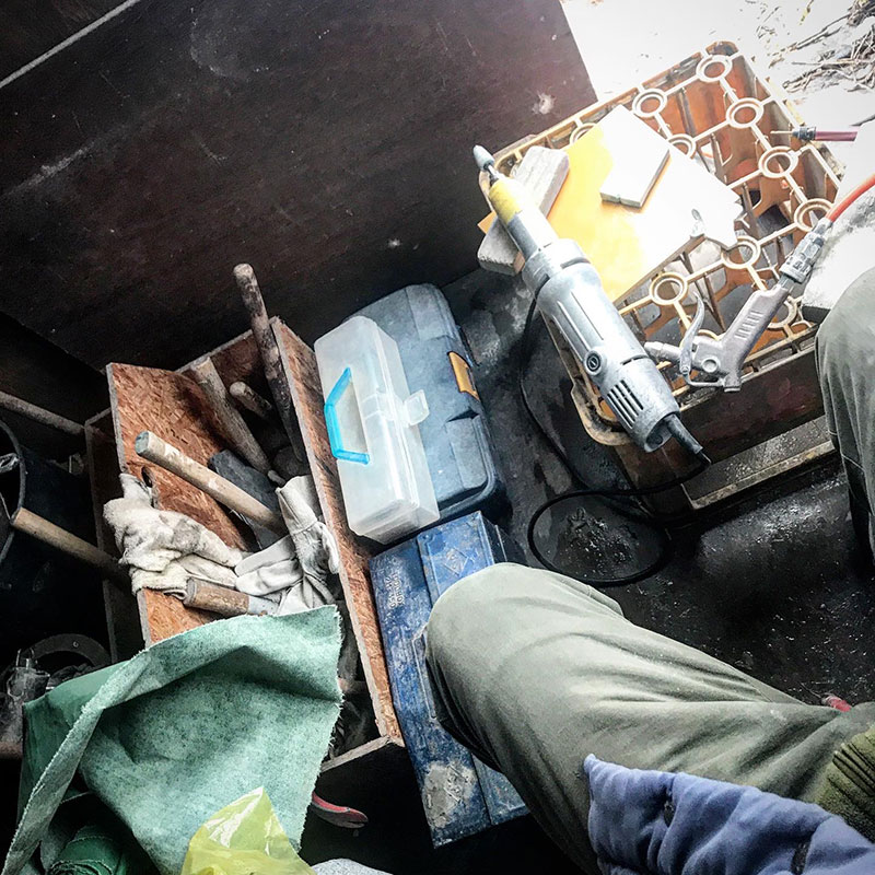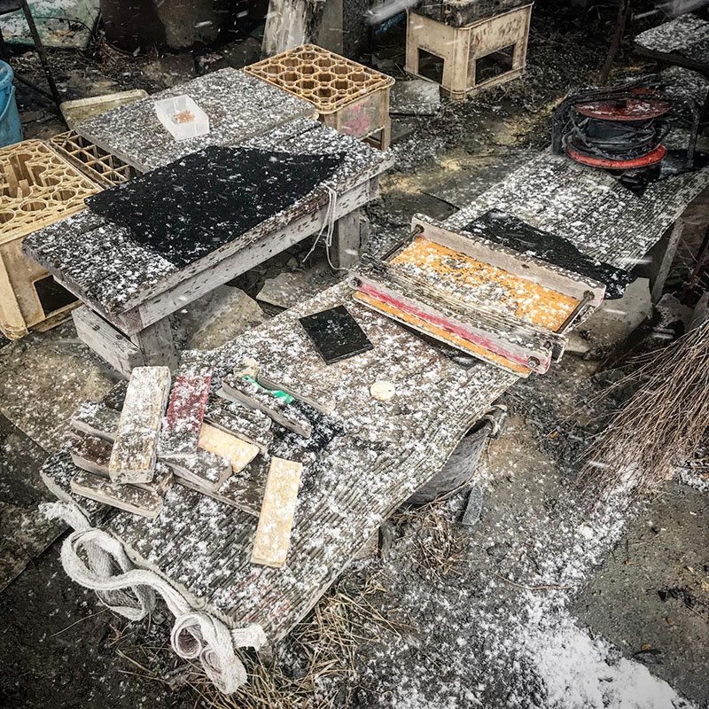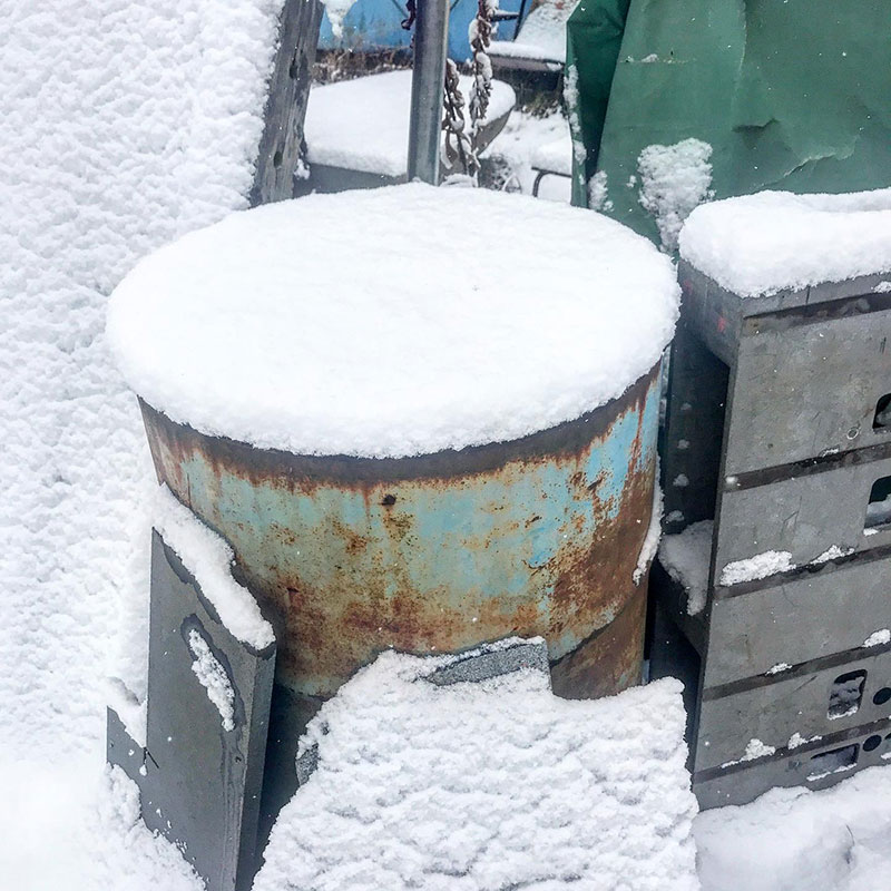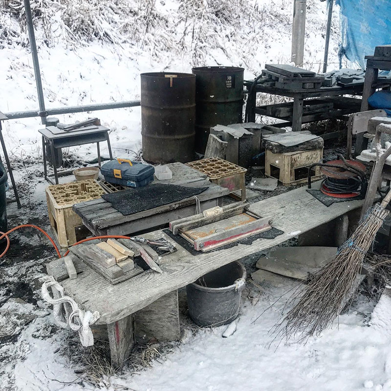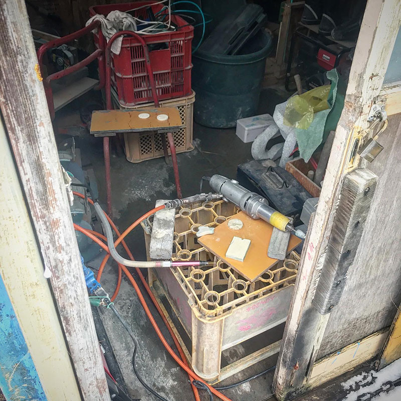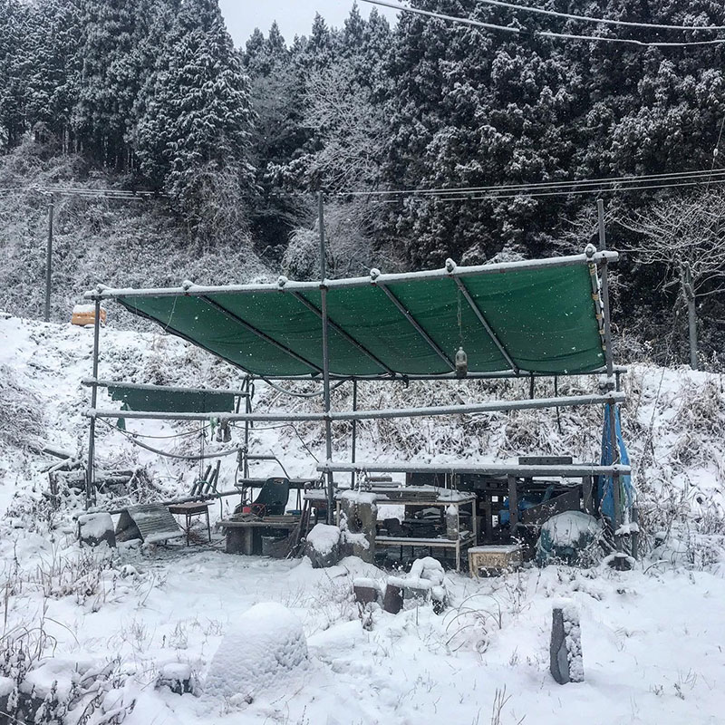 テント下に雪が吹き込んで仕事にならないのでプレハブ小屋の入り口で作業。