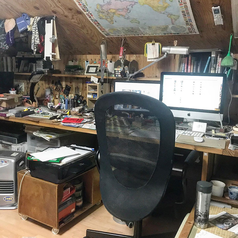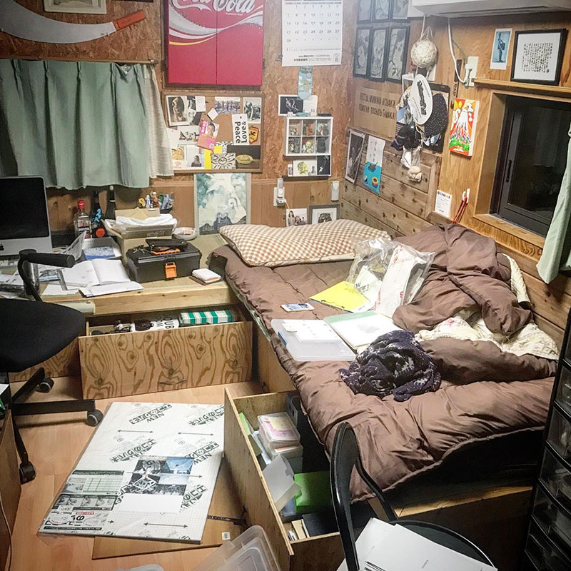 今でも自室にいる時は至福。全長3メートルのデスクを作るための木材搬入は長くて大変だった。床は大きな紙でもデッサンもできるように凸凹や溝の無いフローリング仕上げにしたので床ででかいパネルを切る作業もやりやすい。