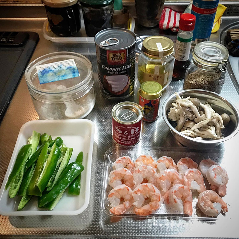 グリーンカレーを食べたいんだけど地元のスーパーでグリーンカレーペーストを見つけられないので夕食に家にあった材料だけでなんちゃってグリーンカレー作った。